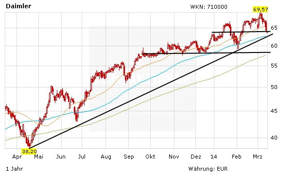 Die Krim-Krise sorgt allen voran an der deutschen Börse für kräftige Abschläge. Politische Börsen sind stets eine Bremse. Alle Fundamentaldaten rücken vorerst in den Hintergrund. Anleger müssen jetzt einen kühlen Kopf bewahren. Die Aktie von Daimler liegt in der aktuellen Korrektur noch gut im Rennen. Charttechnisch ist alles im Lot. Zwar hat die horizontale Unterstützung bei knapp 65 Euro nicht gehalten, jedoch ist das kein Beinbruch.