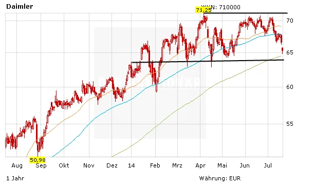 Trotz der schwachen Marktverfassing am Donnerstagabend und Freitag, technisch sieht die Daimler-Aktie - noch - gut aus. Nach dem langen Aufwärtstrend ist das Papier in die Seitwärtsbewegung übergegangen. Unterstützung liefert jetzt die 200-Tage-Linie. Knapp darunter, bei rund 64 Euro, ligt ein stärkerer Support. Im Moment ist Krisenstimmung angesagt, der DAX kommt nicht in die Gänge. Nur, ohne einen freundlichen Gesamtmarkt wird auch die Daimler-Aktie nicht weiter zulegen. Sicherlich wird das Papier nicht noch einmal 45 Prozent wie im Jahr 2013 laufen. Dennoch, die Aktie ist an schwachen Tagen immer einen Blick wert.
