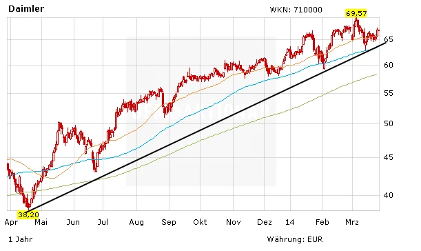 Die Daimler-Aktie liegt nach wie vor gut im Rennen. Der langfristige Aufwärtstrend, den die Aktie seit Anfang 2013 ausgebildet hat, ist weiterhin intakt. Die Aktie glänzt mit Relativer Stärke. Ein freundlicher Gesamtmarkt Vorausgesetzt, wird Daimler bald das alte Hoch wieder in Angriff nehmen. Unterstützung bekam das Papier von Analyst Christian Ludwig vom Bankhaus Lampe. "Die Daimler AG ist mit einem Pkw-Absatzwachstum nach zwei Monaten von 13,2 Prozent sehr gut ins Jahr gestartet. Auch wichtige Lkw-Märkte senden positive Signale". Ludwig schraubte sein Kursziel für die Daimler Aktie von 70 auf 82 Euro nach oben.
