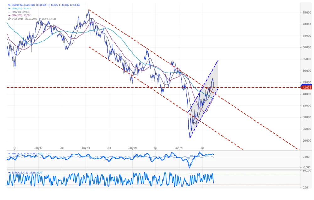 Unterbrochen von kleineren Konsolidierungsphasen lautet das nächste Etappenziel für die Daimler-Aktie 50,00 Euro. Wird auch diese Hürde genommen, liegt das nächste Kursziel im Bereich von 54,50 Euro und 55,00 Euro.