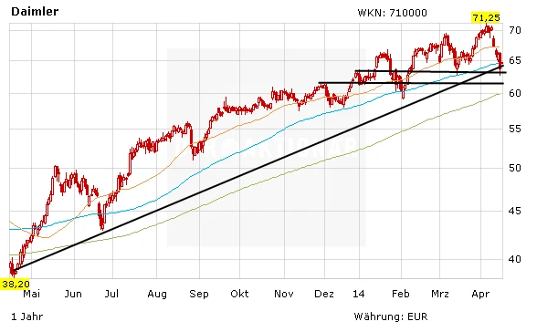 Die Daimler-Aktie steht in den letzten Tagen besonders unter Druck. Es ist zu beobachten, dass gerade die Werte mit einer guten Performance in den letzten Monaten auf der Verkaufsliste stehen. Im Zuge dessen ist die Daimler-Aktie kurzzeitig unter die Aufwärtstrendlinie gefallen. Dennoch ist noch nichts passiert: Auf die Daimler-Aktie wartet eine weitere Unterstützungen bei 63,50 Euro. Knapp darunter verläuft ein weiterer horizontaler Widerstand bei 61,00 Euro.