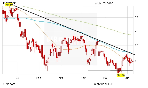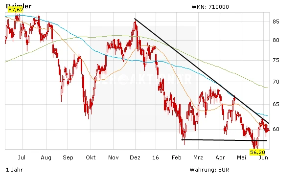 Die letzten Wochen stellten die Anleger auf eine harte Probe. Blickt man auch die Daimler-Aktie, so könnte nun endlich die Basis für einen neuen Aufwärtstrend gelegt sein. Klar ist, dass die Autobauer vor einem radikalen Wandel stehen. Verbrennungsmotoren gehören über kurz oder lang der Vergangenheit an, immense Investition in Elektroautos, autonomes Fahren, Car-Sharing müssen getätigt werden, oder man bleibt auf der Strecke. Das wird nicht nur viele Milliarden Euro verschlingen. Daimler hat in den letzten Jahren gezeigt, mit seinen Modellen den Nerv der Zeit und den Geschmack der Konsumenten zu treffen. Jetzt muss man mit neuen Ideen und Konzepten punkten. Dann wird auch die Aktie wieder Boden gut machen. Derzeit kann man als Anleger einen Fuß in die Tür stellen. Wird die Marke von 62,20 Euro und damit die 90-Tage-Linie geknackt, kann man die Position ausbauen. Stopp: 54,90 Euro.