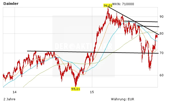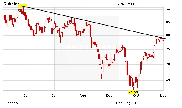 Nachdem sich das Momentum für Autoaktien wieder aufgehellt hat, steht die Daimler-Aktie kurz vor dem Sprung über den Abwärtstrend der bei knapp 79,50 Euro verläuft. Im Anschluss daran könnte das Papier bis zum Widerstand bei 85 Euro aus dem Monat Juli nach oben laufen. Mit einem freundlichen Gesamtmarkt im Rücken sind bis zum Jahresende sogar Kurse zwischen 87,50 und 90 Euro möglich.