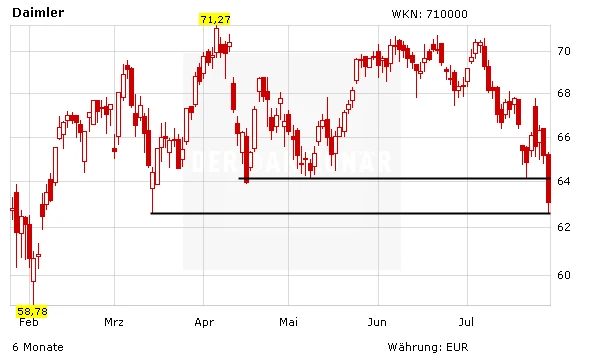 Die Daimler-Aktie hat im Tagesverlauf die Unterstützung bei 64 Euro gebrochen, allerdings exakt beim Zwischentief von 62,65 Euro wieder nach oben gedreht. Kurzfristig könnte der Gesamtmarkt weiteren Druck auf die Aktie ausüben, doch langfristig bleibt Daimler aussichtsreich.