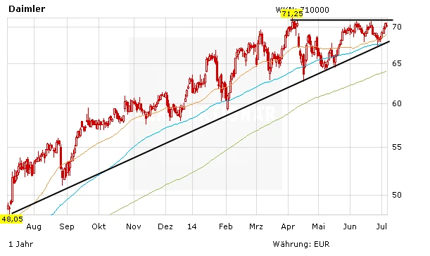 Die Daimler-Aktie hinterlässt chattechnisch eine gute Figur. Die Konsolidierung ging bis auf die untere Begrenzung des Aufwärtstrendkanals. Unterstützung lieferte auf diesem Niveau auch 90-Tage-Linie. Im Anschluss schlug die Aktie wieder den Weg nach oben ein. Jetzt gilt es das alte Hoch von 71,25 Euro zu knacken, dann wäre das nächste Etappenziel die Marke von 75 Euro.