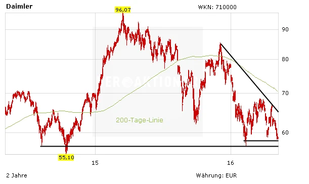 Die Situation bei Daimler bleibt spannend. Nach wie vor testet die Aktie die wichtige Unterstützungszone zwischen 58 und 60 Euro. Anleger sollten nun aufpassen, dass der DAX-Titel nicht nach unten durchgereicht wird. Der Stopp des AKTIONÄR liegt bei 57,50 Euro und sollte genau im Auge behalten werden.