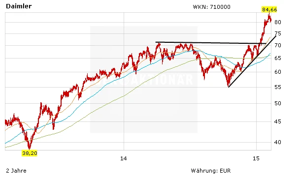 Im Anschluss haben viele Analysten ihre Kursziele für Daimler nach oben geschraubt. Analyst Christian Ludwig vom Bankhaus Lampe sieht mittlerweile Kurse von 94 Euro. Und auch am Montag legen die Commerzbank und Goldman Sachs nach. Ihre Kursziele lauten 93 beziehungsweise 89 Euro. Warburg Research hat das Kursziel für Daimler sogar von 85 auf 95 Euro angehoben. Der Autobauer habe einen zuversichtlichen Ausblick auf das Jahr 2015 gegeben, so Analyst Marc-Rene Tonn.