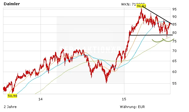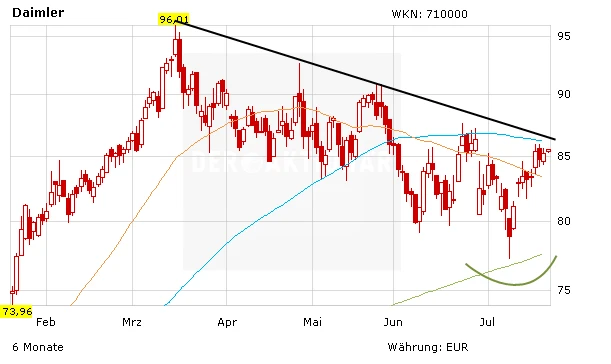 Aufatmen bei den Aktionären. Nach der Abwärtsbewegung hat die Daimler-Aktie bei knapp 80 Euro wieder gedreht. Das Papier nahm in den letzten Tagen wieder Fahrt auf. Nächstes Ziel ist die obere Begrenzung des Abwärtstrendkanals bei rund 86 Euro. Wird dieser nach oben geknackt, lautet das nächste Etappenziel 92 Euro.