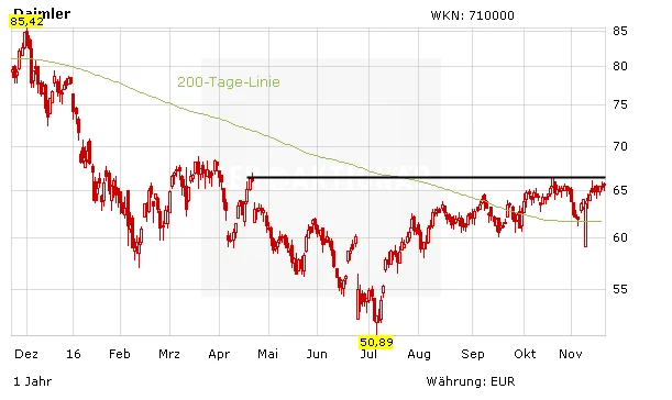 Daimler hat sich gut positioniert für den Wandel in der Branche. Der potenzielle Durchbruch des Elektroautos bereitet dem Konzern keine Sorgen mehr. Zudem ist man bei den herkömmlichen Autos glänzend aufgestellt. Wird ein neues 6-Monats-Hoch erreicht, wäre der Weg nach oben frei. Investierte Anleger setzen auf den Ausbruch. Der Stoppkurs liegt bei 58,50 Euro.