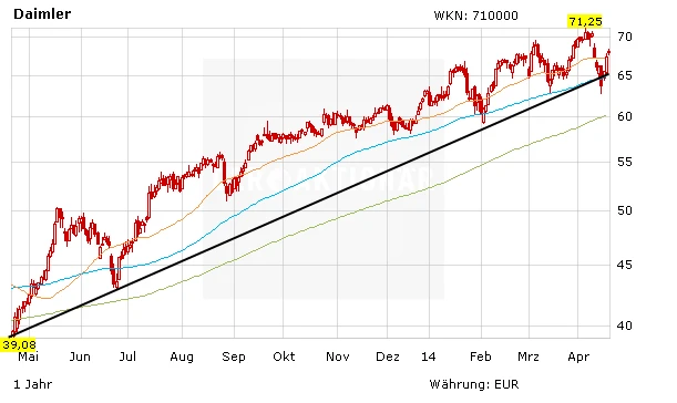 Unter den Automobilwerten hinterlässt nach wie vor die Aktie von Daimler den stärksten Eindruck. Im Gegensatz zu BMW und VW läuft das Papier in einem nach wie vor intakten Aufwärtstrend nach oben. „Die Daimler AG ist sehr gut ins neue Jahr gestartet. Die Auslieferungen im ersten Quartal sind um 13,5 Prozent gestiegen“, sagt Bankhaus Lampe-Analyst Christian Ludwig.