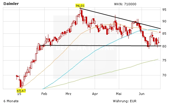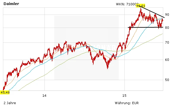 Die Aktie hat nach der scharfen Konsolidierung bis auf 80 Euro wieder nach oben gedreht. Hier traf das Papier auch auf eine massive Unterstützung. Wird der kurzfristige Abwärtstrend bei knapp 87 Euro nach oben geknackt, lautet das nächste Etappenziel 90 Euro. Ende des Jahres sollte die Daimler-Aktie dann deutlich über der Marke von 100 Euro notieren.