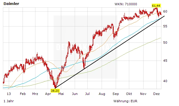 Auch die Daimler-Aktie konnte sich der Konsolidierung am Gesamtmarkt nicht entziehen. Langsam nähert sich die Daimler-Aktie der unteren Begrenzung der Aufwärtstrendlinie bei knapp 58 Euro. Von diesem Niveau aus könnte eine neue Aufwärtsbewegung starten. Investierte Anleger bleiben auf jeden Fall dabei.