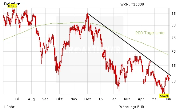 Die Daimler-Aktie hängt nach wie vor im Bereich der 60-Euro-Marke fest. Gelingt jetzt der Ausbruch aus dem Abwärtstrend, dürfte der Weg wieder nach oben führen. Anleger, die auf eine Erholung im Autosektor setzen wollen, können zugreifen. Der Stoppkurs des AKTIONÄR bei 55 Euro sollte aber beachtet werden.