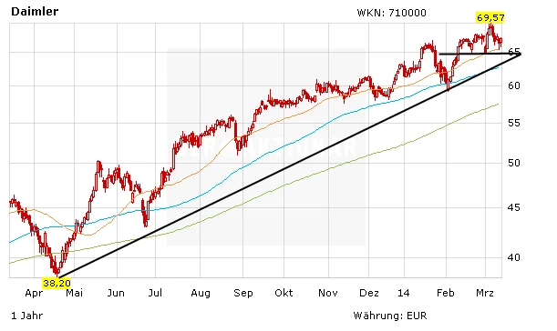 Die beiden Autobauer Volkswagen und BMW glänzen am Donnerstag mit guten News. Beide Aktien liegen deutlich im Plus. Im Windschatten der beiden Konkurrenten legt auch das Papier von Daimler zu. Derweil machte Daimler-Chef Dieter Zetsche deutlich, dass er bei seiner Aufholjagd gegenüber den Konkurrenten Audi und BMW verstärkt auf Dienstleistungen setzen wird. "Service, Kundenkomfort und die Markenstärke sind die entscheidenden Hebel im Premiumsegment", sagte Zetsche in einem Interview mit dem Handelsblatt. Im Sommer startet Daimler ein neues Serviceportal unter dem Namen "Mercedes Me". Es soll eine Online-Plattform für den Kontakt zum Kunden werden. Dazu gehören Dienste wie Carsharing, Taxivermittlungen sowie Finanzierung.