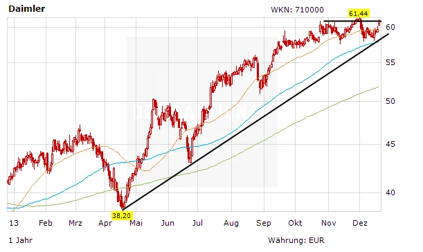 Die Vorzeichen für weiter steigenden Kurs bei Daimler stehen gut. Der Autobauer will sein neues Mittelklassemodell C-Klasse zügig ausrollen. Von der runderneuerten C-Klasse - dem volumenstärksten Modell der Schwaben - verspricht sich Daimler Impulse bei der Aufholjagd auf die enteilte Konkurrenz. Dabei sollte Daimler auch entgegenkommen, dass sich die europäische Autokonjunktur langsam aber sicher erholt. Zuletzt haben eher die asiatischen Märkte, sowie der US-Automarkt die Verkäufe angekurbelt.