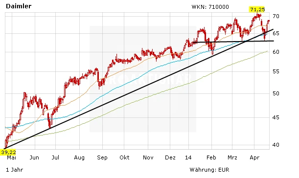 JP Morgan-Analyst Jose Asumendi erwartet ein solides erstes Quartal von Daimler. Deshalb hat der Experte die Einstufung für die Aktie des Autobauers vor den Zahlen für das erste Quartal auf "Overweight" mit einem Kursziel von 80 Euro belassen. Die Margen bei Mercedes-Benz dürften im Jahres- wie im Quartalsvergleich zugelegt haben. Ohnehin hinterlässt die Daimler-Aktie derzeit im Vergleich zu VW und BMW den technisch besseren Eindruck. Das Papier hat sich in den langfristigen Aufwärtstrend zurückgekämpft. Weitere Impulse könnten von der Automesse in Peking im lauf der Woche kommen.