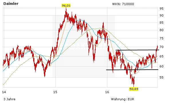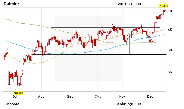 Die Aktie ist im freundlichen Gesamtmarkt endlich aus dem Seitwärtstrend zwischen 58,50 Euro und 66,00 Euro ausgebrochen. Auch das Hoch aus dem Monat Oktober bei 66,50 Euro wurde nach oben geknackt. Eine Konsolidierung bis auf das März-Hoch bei 68,88 Euro ist möglich. Im Anschluss sollte die Aktie Kurs Richtung 75 Euro nehmen. Anleger bleiben auf jeden Fall investiert.