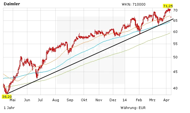 Am Donnerstag zählte die Daimler-Aktie zu den stärksten Verlierern im DAX. Der Stuttgarter Autobauer schüttete 2,25 Euro je Stammaktie an seine Anteilseigner aus, notierte also ex-Dividende. Der Kursabschlag ging allerdings darüber hinaus. Am Ende des Tages stand ein Minus von 4,5 Prozent. Klar ist die Daimler-Aktie in den letzten zwölf Monaten mit einem Plus von rund 65 Prozent super gelaufen. Dennoch, mit der Modelloffensive im Rücken sollte das Papier auch in den nächsten Monaten weiter zulegen. "Wir wollen auch neue Kunden gewinnen, indem wir für Mercedes-Benz neue Segmente erschließen", kündigte Daimler-Chef Dieter Zetsche an. Crossover-Modells, einer Mischung aus Geländewagen und Coupé, das über Ostern auf der Automesse in Peking vorgestellt werden soll. Bislang bietet nur der Rivale BMW mit dem X6 erfolgreich ein ähnliches Modell an. Daimler will diese Lücke im eigenen Modellprogramm schließen.