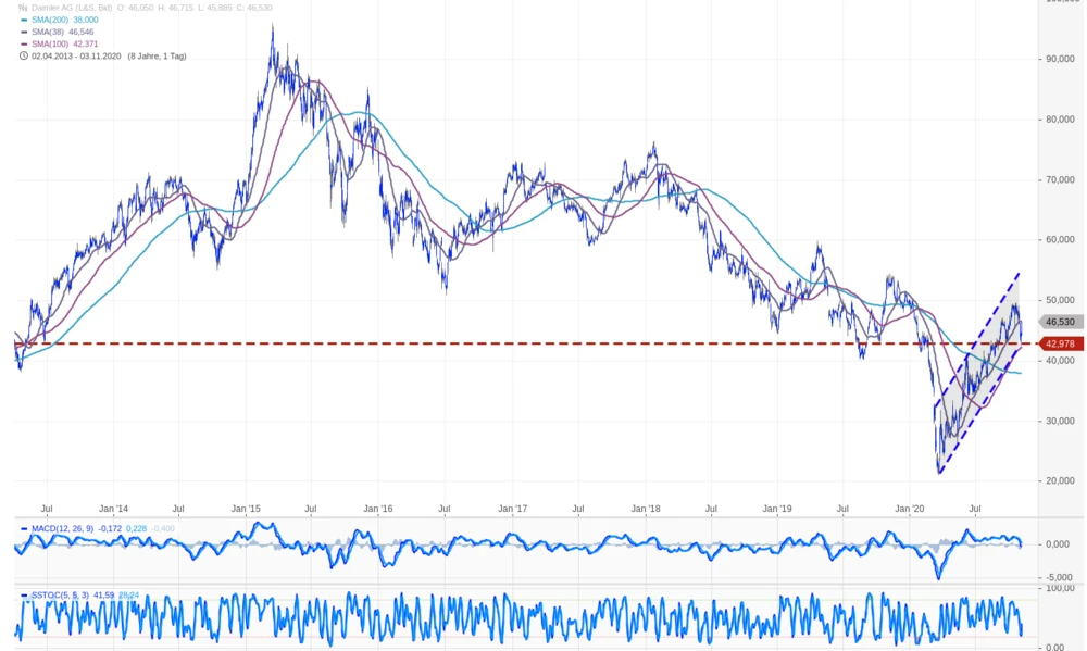 „Die Aktie von Daimler hat am 30.10.2020 ihren eingeschlagenen Aufwärtsmodus bestätigt. Zudem verlaufen nun sämtliche Bollinger-Bänder innerhalb dieses Trends. Die Volatilitätsbandbreite beträgt aktuell 50,70 €uro bis 44,01 Euro. Die meisten markttechnischen Indikatoren (MACD, RSI, Momentum, …) zeigen sich neutral. Allerdings signalisiert der übergeordnete Ichimoku-Indikator eine Fortsetzung des aktuellen Aufwärtsmodus. Damit könnte das Obere Bollinger-Band bei rund 51 Euro bald angelaufen werden. Das Halten der Doppelunterstützung am 30.10.20 (42,48 €uro) war ein wichtiges Signal“, sagt Charttechnik-Experte Martin Utschneider von Donner & Reuschel.
