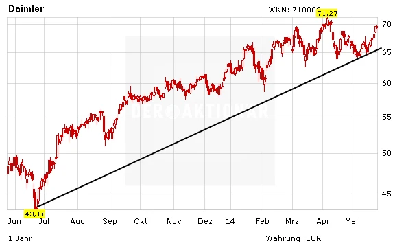 Investierte Anleger bleiben dabei. Die horizontale Unterstützung im bereich der 64-Euro-Marke hat zuletzt gehalten. Die Daimler-Aktie ist daran abgeprallt und befindet sich seit einigen Tagen wieder auf der Überholspur. Gelingt es dem DAX auf 10.000 Punkte zu steigen, dürfte auch Daimler ein neues Jahreshoch markieren. Investierte Anleger bleiben dabei.
