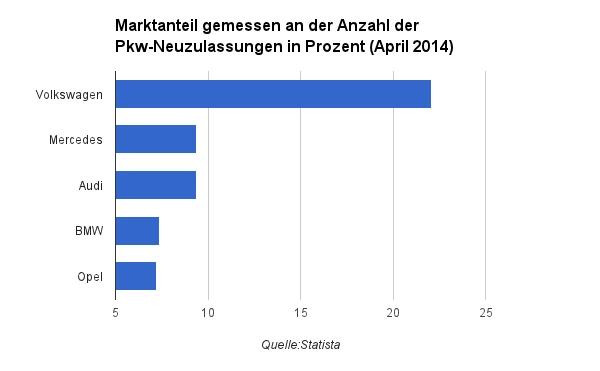 Im vergangenen Monat hatte jedoch Volkswagen bei den Pkw-Neuzulassungen klar die Nase vorn. Mit über 22 Prozent Marktanteil konnten die Wolfsburger Mercedes (9,4 Prozent), Audi (9,4 Prozent), BMW (7,4 Prozent) und Opel (7,2 Prozent) klar auf die Plätze verweisen.