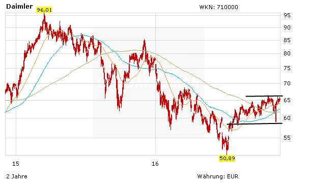 Die Aktie von Daimler hat sich in den letzten Wochen wieder aufgerappelt. Ein erneuter Rücksetzer bis auf die 200-Tage-Line bei knapp 61,50 Euro ist durchaus möglich. Grund ist die Tatsache, dass der DAX aufgrund des anstehenden Italien-Referendums in unruhiges Fahrwasser geraten könnte. Nächster Widerstand nach oben ist das letzte Hoch aus dem Monat Oktober bei 66,50 Euro. Der Stoppkurs bleibt bei 58,50 Euro.