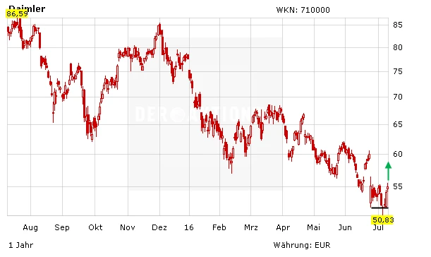Daimler wird derzeit mit einem 2016er-KGV von 7 bewertet. Die Dividendenrendite liegt bei rund sechs Prozent. Selbst wenn der Gewinn dieses Jahr um 20 Prozent einbrechen sollte und nächstes Jahr nur stagniert, wäre die Aktie attraktiv bewertet. Daher setzt DER AKTIONÄR im Real-Depot auf eine Gegenbewegung nach den jüngsten Verlusten. Der Stopp wurde zur Absicherung unter das Tief bei 50,25 Euro platziert.