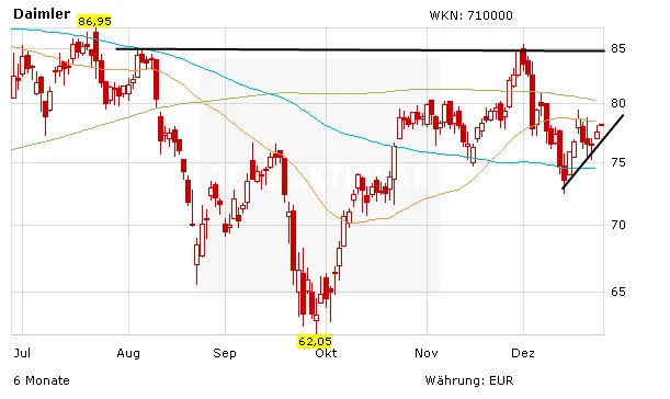 Die Aktie von Daimler hängt nunmehr seit mehreren Wochen an der 200-Tage-Linie fest-. Zwar konnte sich das Papier kurzeitig darüber absetzen, jedoch sorgte der starke DAX-Rutsch nach der EZB-Sitzung Anfang Dezember für einen erneuter Rücksetzer der Aktie. Jetzt nimmer das Papier einen neuen Anlauf, den Widerstand zu knacken. Das würde gleichzeitig ein neues Kaufsignal für die Aktie bedeuten.