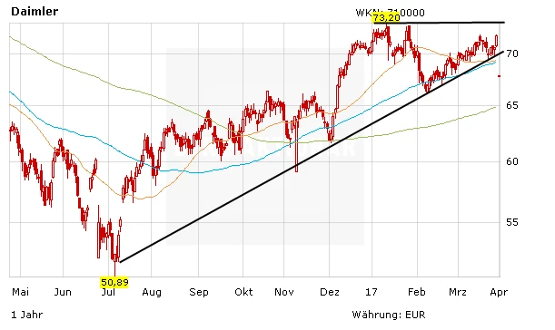 Der Pessimismus rund um die Daimler-Aktie erscheint überzogen. Auf der anderen Seite wird die Tesla-Bewertung derzeit in abenteuerliche Regionen gezogen. Die Daimler-Aktie hat nach den vorläufigen Zahlen wieder Boden gut gemacht. Hebt Zetsche wirklich die Prognose an, wird die Aktie weiter Rückenwind bekommen. Das nächste Ziel wäre der horizontale Widerstand, das Hoch aus den Monaten Januar und März bei 73,20 Euro.