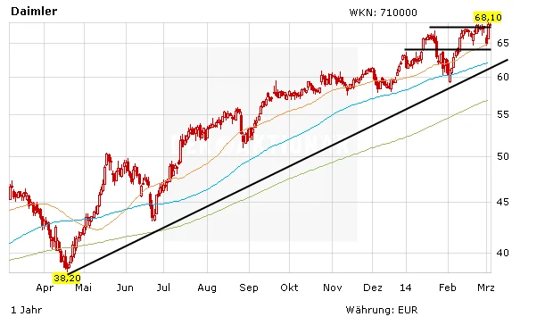 Die Daimler-Aktie sieht technisch hervorragend aus. Am Dienstag markierte das Papier ein neues Hoch. Damit ist der Ausbruch über die 68-Euro-Marke geglückt. Die Daimler-Aktie sollte auch in den nächsten Wochen deutlich besser als der Markt abschneiden.