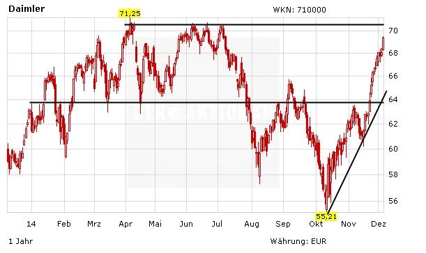 Charttechnisch hat sich das Bild bei Daimler in den vergangenen Wochen deutlich aufgehellt. Der massive Widerstand beim Jahreshoch bei rund 71,20 Euro ist wieder im Visier der Aktie. Mit dem Sprung über diese Hürde wäre der Weg bis zum Allzeithoch bei gut 78,00 Euro frei. Prallt die Aktie allerdings ab, könnte die Unterstützung im Bereich von 64,00 Euro erneut getestet werden.