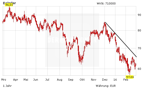 Die Situation bei Daimler hat sich inzwischen wieder etwas verbessert. Dank der genannten Gründe bietet die Aktie inzwischen wieder ein gutes Chance-Risiko-Verhältnis. In einem freundlichen Gesamtmarkt ist die 200-Tage-Linie bei rund 67,50 Euro das nächste Ziel. Anleger sollten aber mit einem engen Stoppkurs fünf bis sieben Prozent unter dem Einstiegskurs agieren.