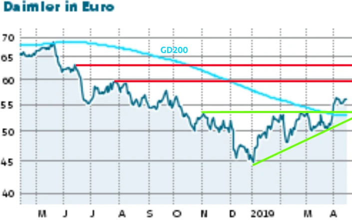 Mit dem Sprung über die 200-Tage-Linie (aktuell bei 52,92 Euro) und dem horizontalen Widerstand bei 54,05 Euro ist der Daimler-Aktie zuletzt ein wichtiges Kaufsignal gelungen. Die Aktie hat in einem freundlichen Gesamtmarkt durchaus das Potenzial, bis in den Bereich zwischen 60,15 Euro und 63,50 Euro zu klettern. Hier liegen die nächsten stärkeren Widerstände. Bestehende Positionen sollten mit einem Stopp knapp unterhalb des Februar-Tiefs abgesichert werden.