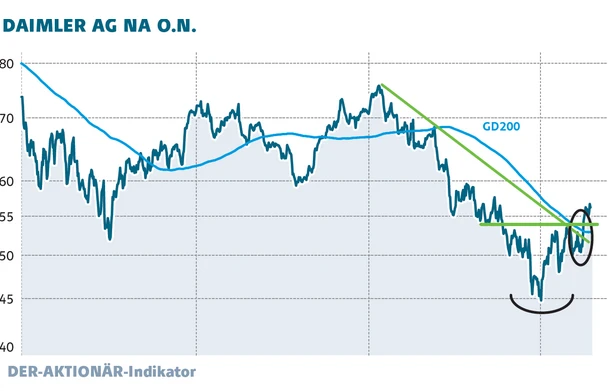 Die Aktie von Daimler hat in der vergangenen Woche ein Kaufsignal geliefert. Sowohl der Abwärtstrend als auch die 200-Tage-Linie wurden geknackt. Mit einem freundlichen Gesamtmarkt im Rücken hat die Aktie durchaus das Potenzial, bis in den Bereich zwischen 60,15 Euro und 63,50 Euro zu klettern. Hier liegen die nächsten stärkeren Widerstände.