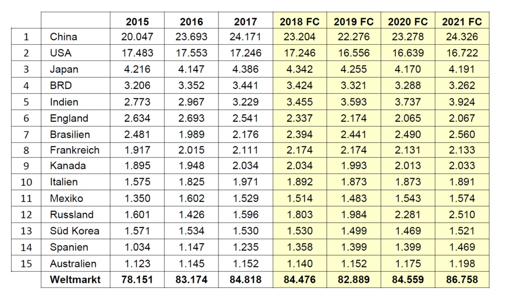 Die wichtigsten Automärkte weltweit (Angaben in 1.000 Fahrzeugen):