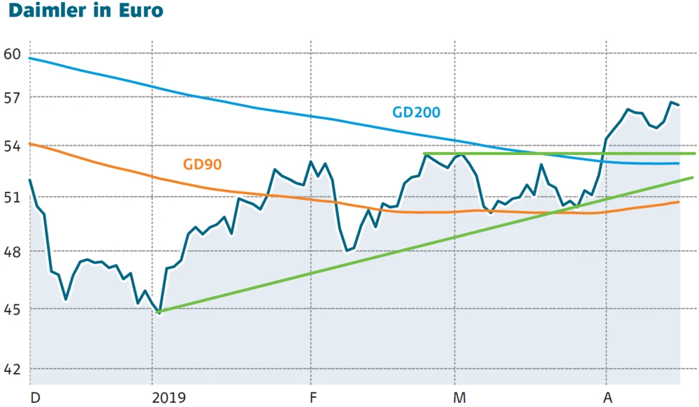 Charttechnisch gibt die Daimler-Aktie wieder eine gute Figur ab. Inzwischen halten sich die Papiere nachhaltig über der wichtigen 200-Tage-Linie. Unterstützung bietet diese Marke im Bereich von 53,00 Euro. Mit einem Unterschreiten wäre das Aufwärtspotenzial vorerst wieder begrenzt.