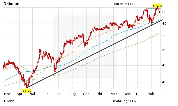 Die freundliche Stimmung zum Wochenausklang schiebt auch die Aktie von Daimler wieder nach oben. Bei einem Ausbruch über das alte Hoch bei 67,13 Euro, sollte die Daimler-Aktie schnell Richtung 70,00 Euro marschieren. Die Analysten jedenfalls sind voll des Lobes für die Aktie. Goldman Sachs sieht ein Kursziel von 83,00 Euro, die französische Societe Generale stellt 76,00 Euro in Aussicht.