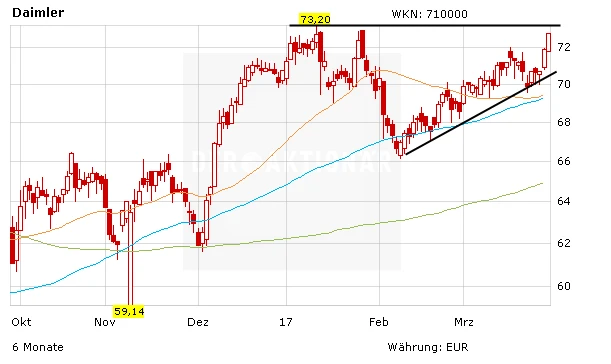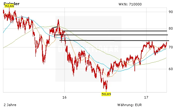 Daimler muss in Sachen E-Mobilität und neue Mobilitätsdienste auf die Tube drücken, um den Anschluss nicht zu verlieren. Was selbstfahrende Autos betrifft, hat das Zetsche-Team mit dem F015 allerdings schon 2015 ein Ausrufezeichen gesetzt. Die Aktie hat in den letzten Tagen wieder Boden gut gemacht. Wird die Marke von 73,20 Euro genommen, kann das Papiere in den Bereich zwischen 75 Euro und 77 Euro laufen. Wer es als Anleger etwas spekulativer mag, der setzt auf den chinesischen Autobauer Geely.