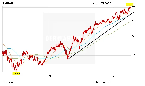 Dieter Zetsche gibt sich voller Elan. „Unsere Zielstrebigkeit zahlt sich aus. Die Lage des Unternehmens ist gut, die Perspektiven sind noch besser", so der Daimler-Vorstand zum Auftakt der Hauptversammlung in Berlin. Zetsche hat auch allen Grund für seinen Optimismus. Die Vorzeichen für weiteres Wachstum stehen gut. Daimler hat eine gute gefüllte Modellpipeline und rechnet auch für 2014 mit Zuwächsen bei Umsatz, Absatz und operativem Ergebnis. Zudem hat die Aktie in den letzten zwölf Monaten deutlich besser als der Gesamtmarkt abgeschnitten. Fast 70 Prozent hat das Papier von Daimler zugelegt. „2013 war ein Jahr, in dem wir nach einem schwierigen Start Schritt für Schritt Fahrt aufgenommen haben“, sagt Zetsche. Weltweit hat Daimler fast 2,4 Millionen Fahrzeuge verkauft. Umgesetzt wurden 118 (im Vorjahr 114,3) Milliarden Euro. Das Konzern-EBIT stieg um 23 Prozent auf 10,8 (im Vorjahr 8,8) Milliarden Euro.