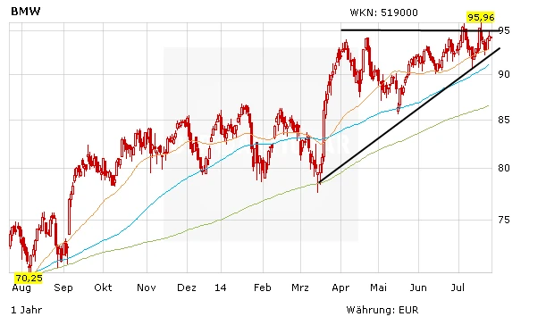 Es sieht ganz danach aus, als könne die BMW-Aktie in diesem Anlauf das alte Hoch bei 95,96 Euro endlich hinter sich lassen. Im Anschluss wäre der Weg nach oben frei, 110 Euro sind durchaus möglich. Reithofer und Co haben in den letzten Quartalen ohnehin immer mit guten Zahlen überrascht.