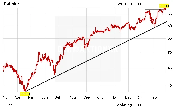 Daimler bleibt trotz der Verkaufsempfehlung von Barclays weiterhin ein attraktives Investment. Die Aktie befindet sich in einem langfristigen Aufwärtstrend und hat das Momentum nach wie vor auf ihrer Seite. Gelingt der nachhaltige Ausbruch über den Widerstand bei 67 Euro, steht einem neuen Mehrjahreshoch im Bereich von 70 Euro nichts mehr im Weg. Mit einem KGV von elf ist der Autobauer außerdem nach wie vor moderat bewertet.