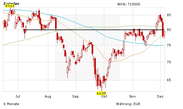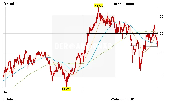 Nach dem Sprung am Dienstag sieht die Daimler-Aktie technisch wieder besser aus. In einem freundlichen Gesamtmarkt sollte die Aufwärtsbewegung bis an die 200-Tage-Linie bei rund 80,50 Euro heran reichen. Diese stellt dann die nächste Hürde dar. Wird diese nachhaltig überwunden, entsteht ein neues Kaufsignal. Kursziel: 85 Euro.