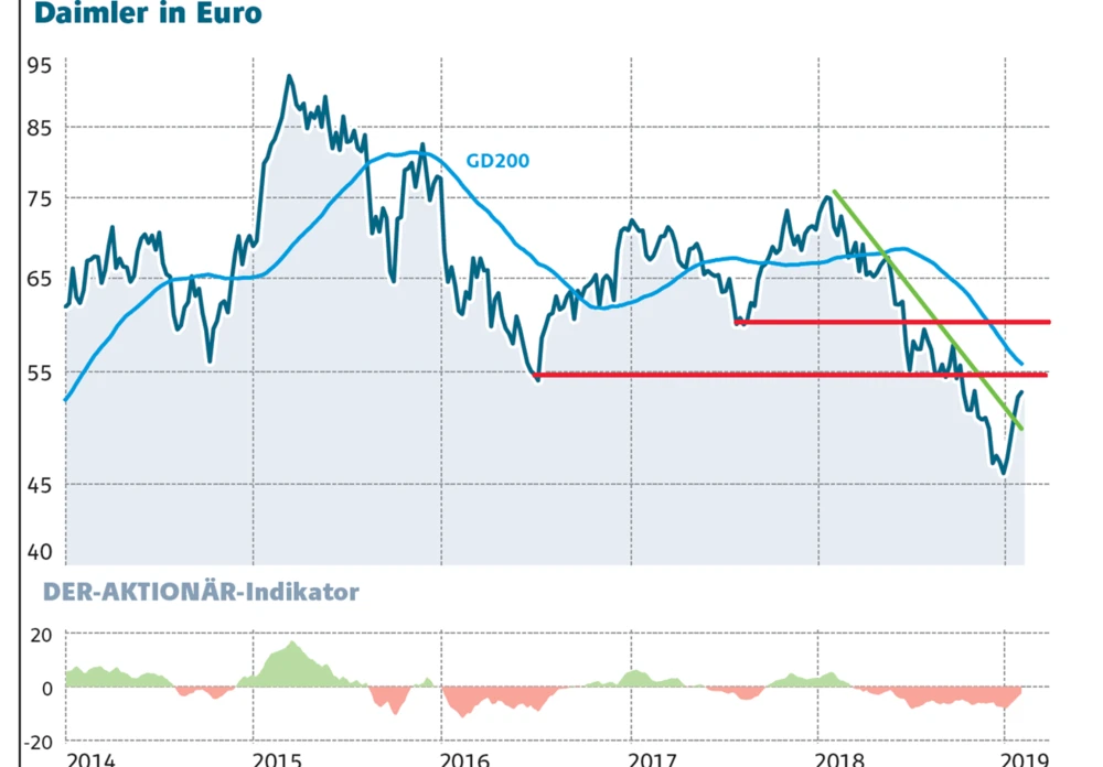 Vom Jahreshoch im Jahr 2018 bei über 76 Euro im Januar ging es mit der Daimler-Aktie kontinuierlich abwärts. Am Ende des Jahres stand ein Minus von 35 Prozent. 2019 gibt die Daimler-Aktie bislang keine schlechte Figur ab. 14 Prozent Plus stehen aktuell unter dem Strich.