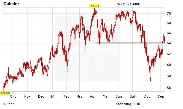 Die Aktie von Daimler startet bereits wieder seit einigen Wochen durch und hat damit die Anfang Juli gestartete Konsolidierung beendet. Dabei gelang dem Wert zuletzt der Sprung über den Widerstand bei 64 Euro. Nun nimmt das Papier Kurs auf das Jahreshoch bei 71,27 Euro. Analyst Zafer Rüzgar von Independent Research geht sogar noch weiter. Er bekräftigte zuletzt sein „Kauf“-Rating mit einem Kursziel von 83 Euro.
