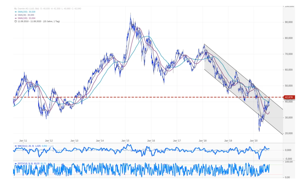 „Übergeordnet zeigt sich das Chartbild der Daimler-Aktie noch abwärtsgerichtet. Der Kurs bleibt somit anfällig für weitere Kurseinbußen. Wenn allerdings der nachhaltige Ausbruch über die 42,30 Euro gelingt, dann könnten die Papiere den seit Januar 2018 (!) intakten Abwärtsmodus verlassen. Langfristig orientierte Anleger sollten aber daher diesen nachhaltigen Bruch abwarten. Am übergeordneten technischen Downside-Modus ändert sich weiterhin erst nach dem Überhandeln der 42,30 Euro etwas. Die Slow-Stochastik generiert aktuell sogar ein Verkaufssignal. Der mittelfristige MACD-Indikator zeigt sich neutral. Es steht und fällt somit mit den 42,30 Euro“, sagt Charttechnik-Experte Martin Utschneider von Donner & Reuschel.