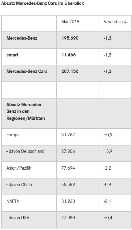 Der Autobauer Daimler hat weiter keinen guten Lauf beim Verkauf neuer Autos. Von der Stammmarke Mercedes-Benz verkauften die Stuttgarter im Mai weltweit 195.690 Wagen und damit 1,3 Prozent weniger als im Vorjahresmonat, wie der DAX-Konzern am Mittwoch mitteilte. Besonders schmerzlich ist ein leichter Rückgang im wichtigsten Einzelmarkt China, den das Plus in Deutschland und Europa nicht wettmachen konnte. Im Jahresverlauf steht Mercedes nach fünf Monaten bei 938.499 verkauften Autos, das sind 4,7 Prozent weniger als im Vorjahr.