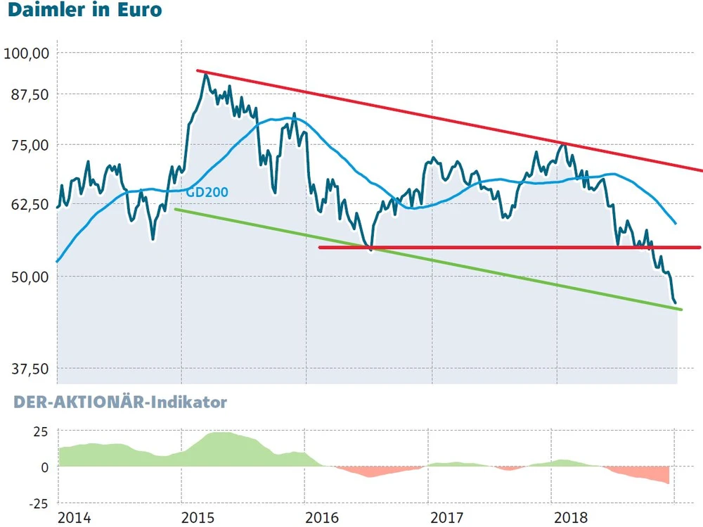Die Meldung von Daimler ist ein Schritt in die richtige Richtung. Allerdings auch ein erzwungener. Das Investitionsprogramm wird Marge kosten, was der Kurs längst widerspiegelt. Die Aktie bleibt dennoch im Abwärtstrend ist aber bereits an der unteren Begrenzung ihres Trendkanals angekommen, was kurzfristig für eine Erholung sprechen würde. Ein Einstieg drängt sich dennoch nicht auf. Einen neuen technischen Impuls gibt es erst, wenn die Widerstandszone zwischen 47,50 und 50 Euro geknackt wird.