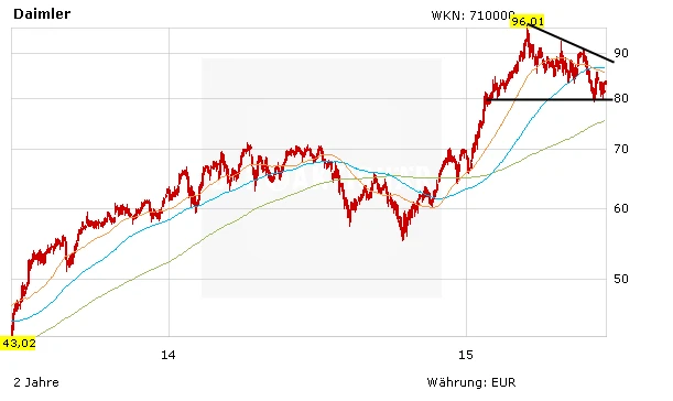 Am wichtigsten seien aber die Anzeichen für eine Erholung des europäischen Automarktes, welche die Ergebnisdynamik in den kommenden Quartalen antreiben sollte, so die Experten. Stützen sollte eine Verbesserung der Einkaufsmanager-Indizes. Daher stuften sie den Sektor, der sich in den vergangenen drei Monaten im marktbreiten Index Stoxx Europe 600 am schlechtesten entwickelt habe, von "Neutral" auf "Overweight" hoch. Bei den Herstellern favorisiert JPMorgan das französische Unternehmen PSA Peugeot Citroen. Ebenfalls mit "Overweight" bewerten die Experten Daimler, BMW und Volkswagen (VW) . Für die Premiumanbieter aus Stuttgart und München spreche zudem die günstige Aktienbewertung. Ohnehin sieht Daimler derzeit auch charttechnisch wieder sehr interessant aus.