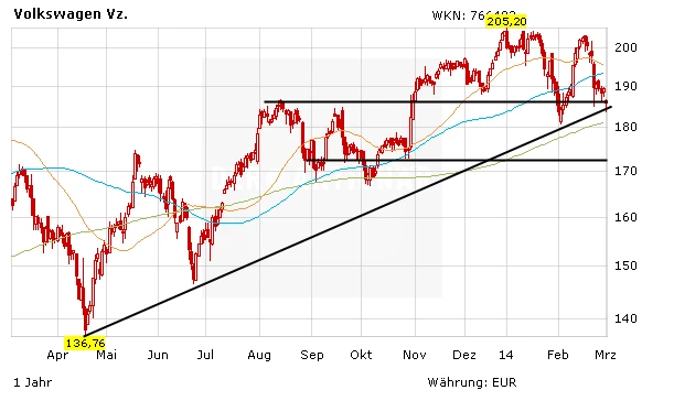 Die Daimler-Aktie lag zuletzt gut in der Spur. Das Papier hat den Dax in den letzten Wochen recht deutlich hinter sich gelassen. Ein Auffanglimit bei 62,50 Euro kann zum Ausbau der Position genutzt werden. Ähnlich die Situation bei Volkswagen. Das Papier notiert im Zuge der laufenden Korrektur derzeit bei rund 185,50 Euro. Anleger setzen ein Abstauberlimit bei 172,00 Euro.