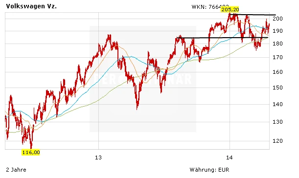 VW wird auch in Zukunft von der Erholung des europäischen Automarktes profitieren. Sehr gut aufgestellt ist man auch in China. Hier profitiert VW auch dank der Premium-Tochter Audi. Die Aktie indes konnte sich noch immer nicht aus dem lang anhaltenden Seitwärtstrend befreien. Erst ein Ausbruch über 205 Euro schafft wieder Kurspotenzial.